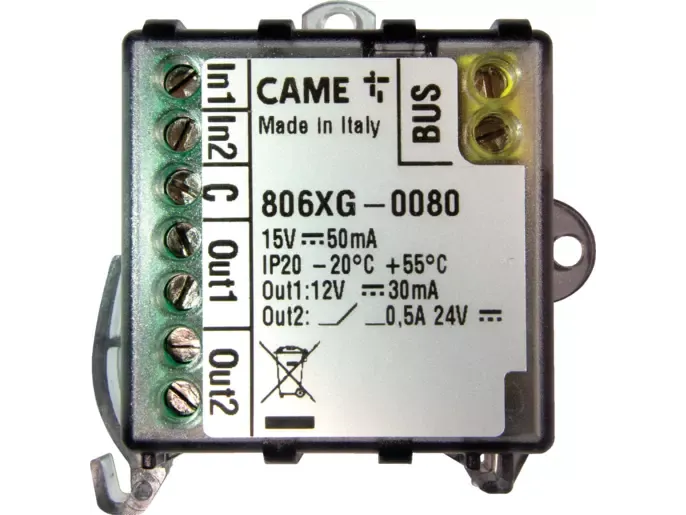 BUS rozširujúci modul s 2 vstupmi a 2 výstupmi. Vstupy je možné konfigurovať ako NO, NC alebo v odporovom režime (8K2), s výstupom pre výstražné svetlo a jedným reléovým výstupom.