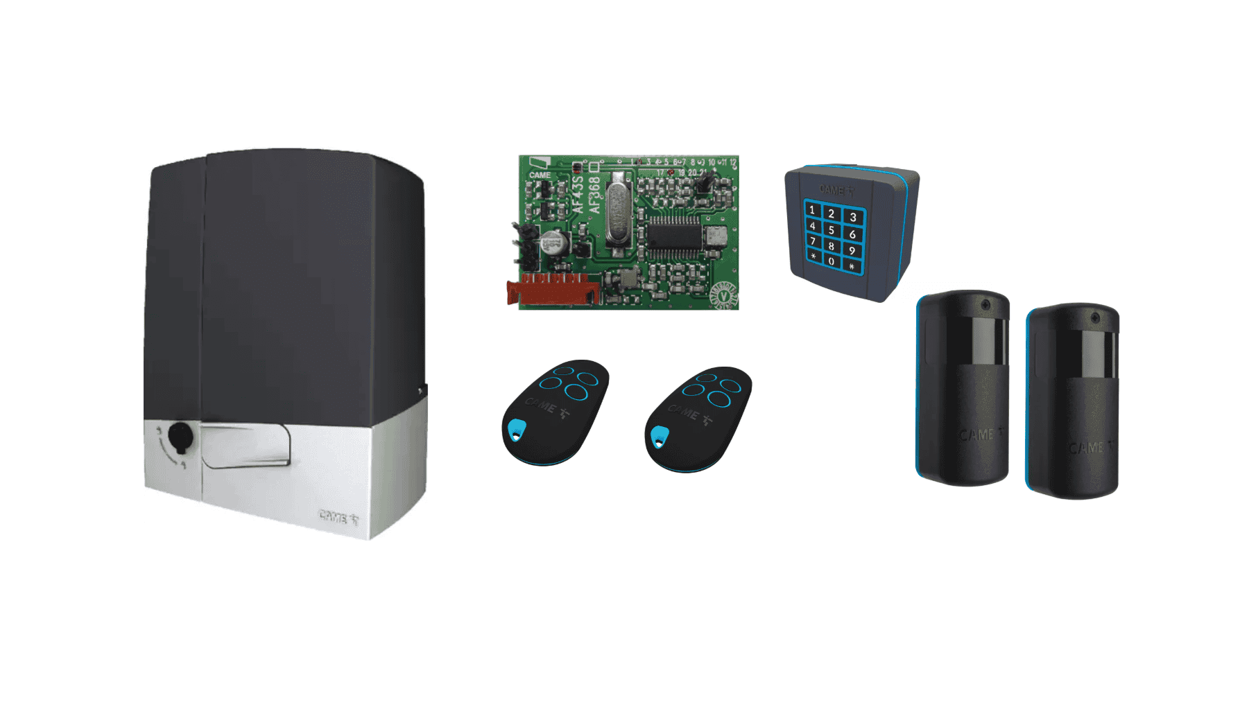 Komplet set s 24 V pohonom BXV10AGE pre posuvné brány s hmotnosťou do 1000 kg, vybavený riadiacou elektronikou, párom CXN BUS fotobuniek DXR, rádiovou AF kartou s frekvenciou 433,92 MHz, 2 ks 4-kanálových vysielačov TOP s plávajúcim kódom a CXN BUS kódovou klávesnicou.
