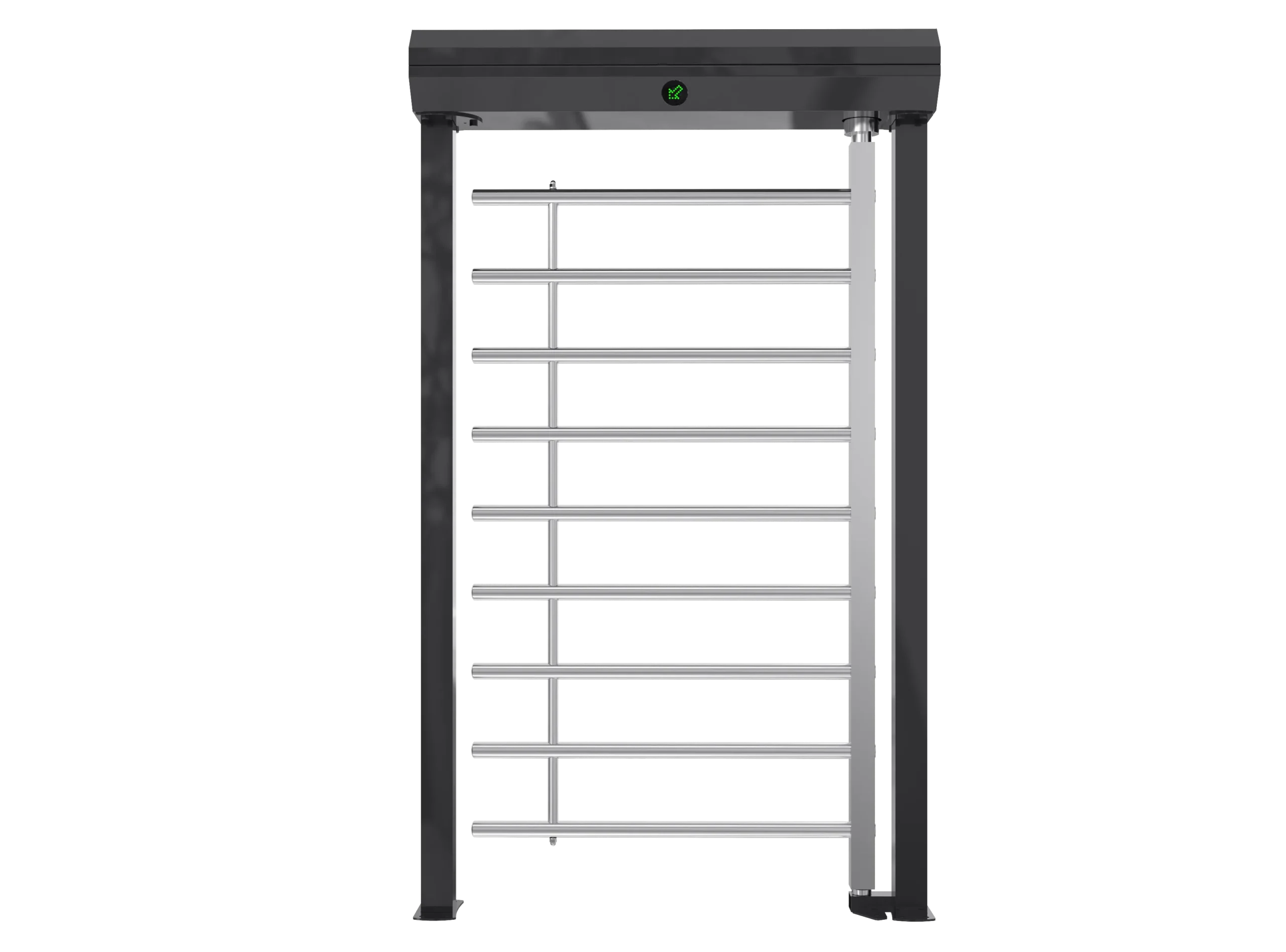 Motorizovaná celovýšková krídlová bránka. Obojsmerná prevádzka s motorovým pohonom, s konštrukciou a krídlom z lakovanej alebo nehrdzavejúcej ocele (dostupné povrchové úpravy sú uvedené nižšie). Dodáva sa s indikátormi stavu a priechodu na prednej strane a LED osvetlením v hornej časti.