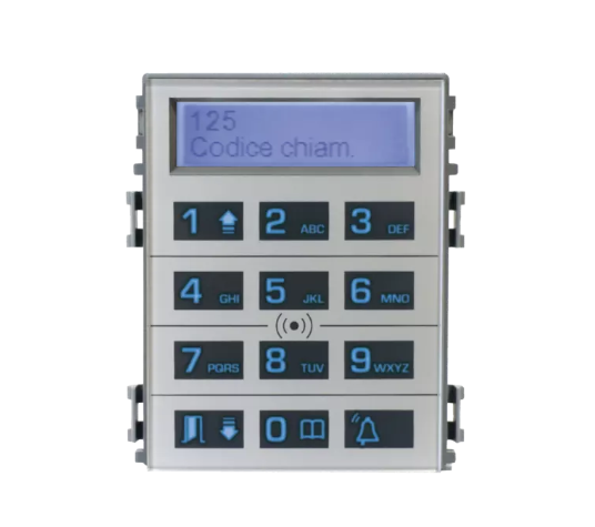 DCOMBO kódová klávesnica s jemnými dotykovými tlačidlami, s LCD displejom a zabudovaným RFID snímačom, pre vstupné panely série THANGRAM. Slúži pre vyhľadávanie (listovanie) v zozname mien užívateľov, zadávanie prístupového kódu a snímanie RFID bezkontaktných kariet/čipov po priložení. Veľkostne zaberá priestor ako 4 jednoduché volacie tlačidlá. Možnosť zapamätať až 1250 mien do adresáru.