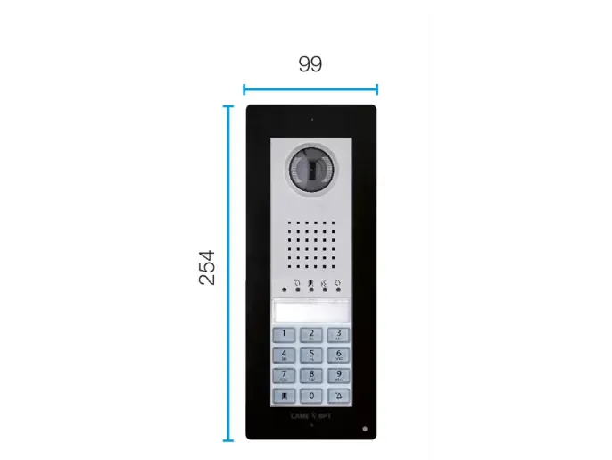 DP/0 prídavný modul s tlačidlami pre vstupné panely série THANGRAM. Maximálne možno vložiť 10 ks jednoduchých (DPS), či dvojitých tlačidiel (DPD) alebo 5 ks tlačidiel s dvojitou výškou (DPH). Prídavný modul je vybavený 20 ks LED pre modré podsvietenie tlačidiel s menovkami. Krytie IP 54.