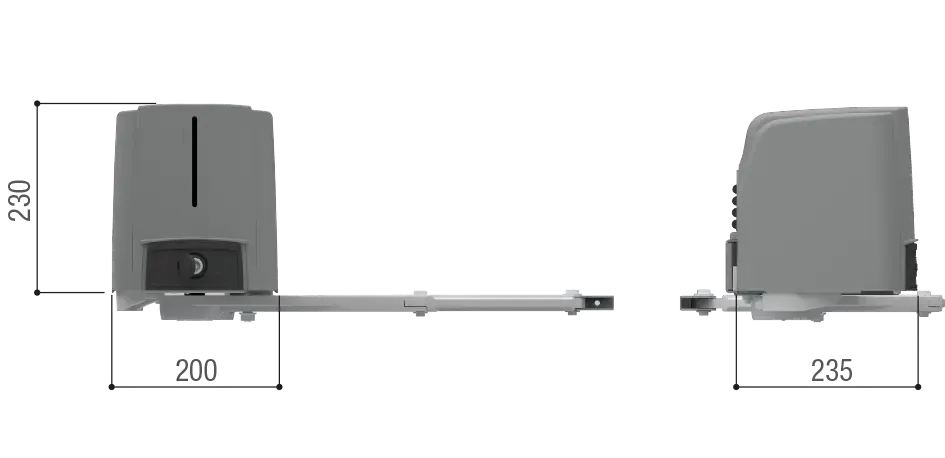 Nevratný 230 V prevodový motor bez elektroniky, s kĺbovým prevodovým ramenom s C max. 200 mm, určený pre krídlové brány s krídlom do šírky 2,3 m a váhou do 200 kg.