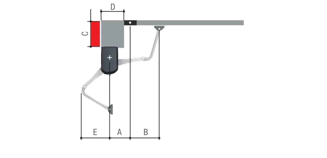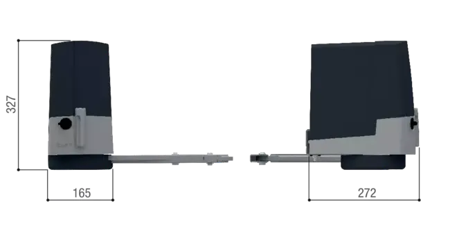 Nevratný 24 V zúžený prevodový SLAVE motor bez elektroniky, s kĺbovým prevodovým ramenom s C max. 250 - 300 mm, určený pre krídlové brány s krídlom do šírky 2,3 m a váhou do 200 kg. Farba sivá (RAL7024).