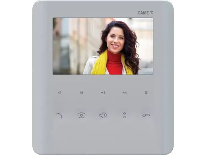 Hands-free video vrátnik s interkomom v bielom prevedení, vybavený mäkkými dotykovými tlačidlami, 5″ LCD displejom a 4 tlačidlami určenými pre interkomové hovory alebo pomocné príkazy. Zariadenie disponuje tlačidlom na úpravu alebo úplné vypnutie zvonenia a je vybavené aj funkciou pre užívateľov so sluchovým postihnutím a načúvacím prístrojom.