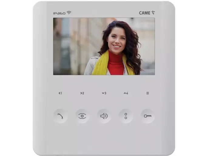 Päť dotykových tlačidiel zabezpečuje základné funkcie: hovory, otvorenie dverí, automatické zobrazenie kamery, úpravu/vypnutie zvonenia (s LED) a AUX príkaz.
