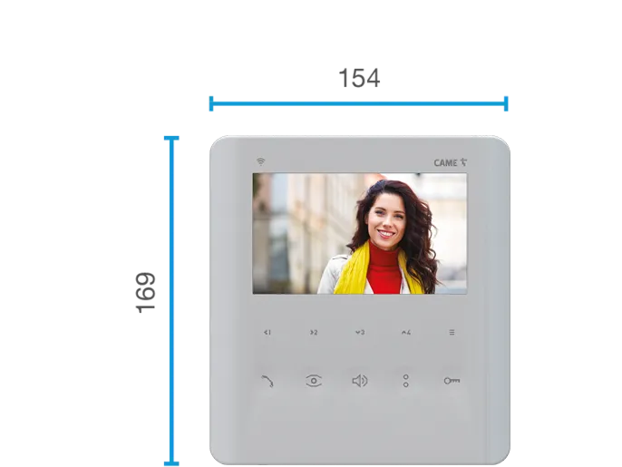 Hands-free video vrátnik s interkomom v bielom prevedení s mäkkými dotykovými tlačidlami, 5″ LCD displejom, 4 pomocnými tlačidlami, Wi-Fi pripojením a verziou s funkciou pre užívateľov so sluchovým postihnutím a načúvacím prístrojom.