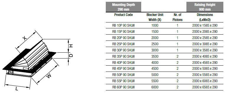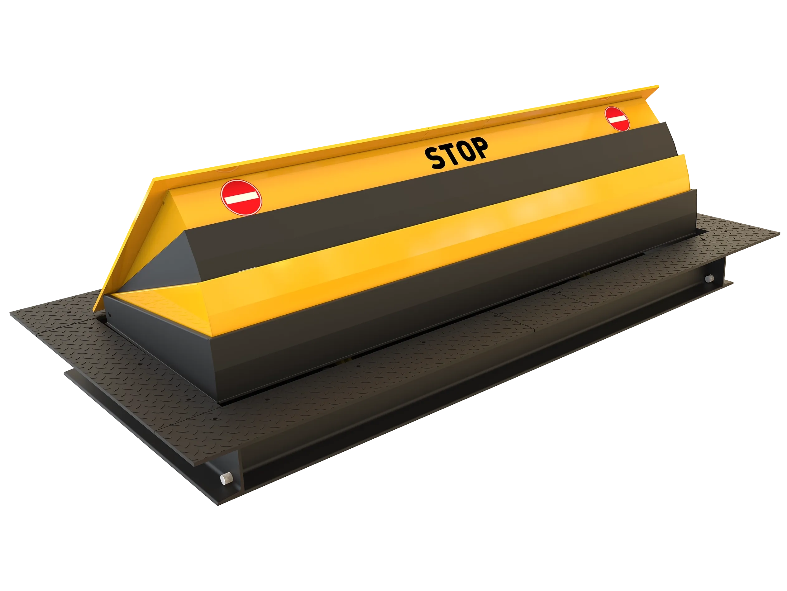 Hydraulický cestný blokátor s plytkou montážou a s externou hydraulickou jednotkou, ktorá je umiestnená v centrálnej jednotke a riadená pomocou PLC. Rozmery mobilného nárazového bloku sú k dispozícii v šírkach od 1 do 6 metrov (odstupňované po 0,5 m) a v dvoch výškach: 0,6 a 0,9 m.