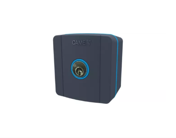 Kľúčový ovládač s napájaním CXN BUS, s cylindrickou vložkou a modrým LED podsvietením, určený na povrchovú montáž.