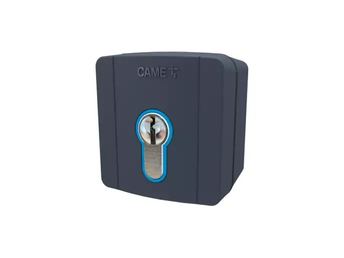 Kľúčový ovládač s napájaním 230 V AC, s cylindrickou DIN vložkou a modrým LED podsvietením, určený na povrchovú montáž