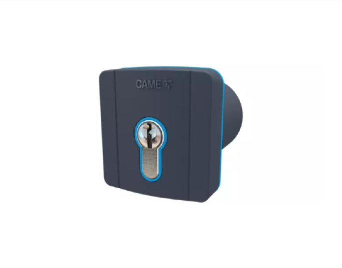 Kľúčový ovládač s napájaním CXN BUS, s cylindrickou DIN vložkou a modrým LED podsvietením, určený na zápustnú montáž.