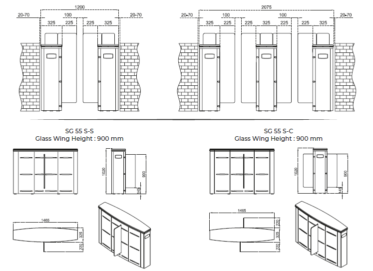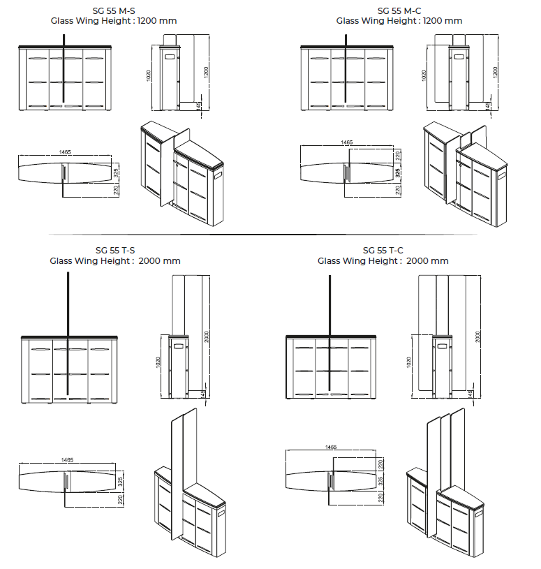 Konštrukcia je vyrobená z brúsenej nerezovej ocele AISI 304 (voliteľne AISI 316), čierny panel a podsvietené krídla z tvrdeného skla (výška krídiel 900, 1200 alebo 2000 mm). Je vybavená bočnými indikátormi stavu a indikátorom priechodu na vrchnej časti. Zariadenie je navrhnuté pre párovú prevádzku (Master a Slave). Monitoring vstupu zabezpečuje integrovaný infračervený systém. Produkt je dostupný v jednoduchej aj dvojitej verzii a dodáva sa s montážnou šablónou pre inštaláciu do podlahy pre šírku priechodu 550 mm.