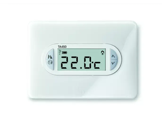 Biely digitálny nástenný termostat s krytom vo farbe ľadová biela. Napájanie tromi 1,5 V batériami typu AAA.