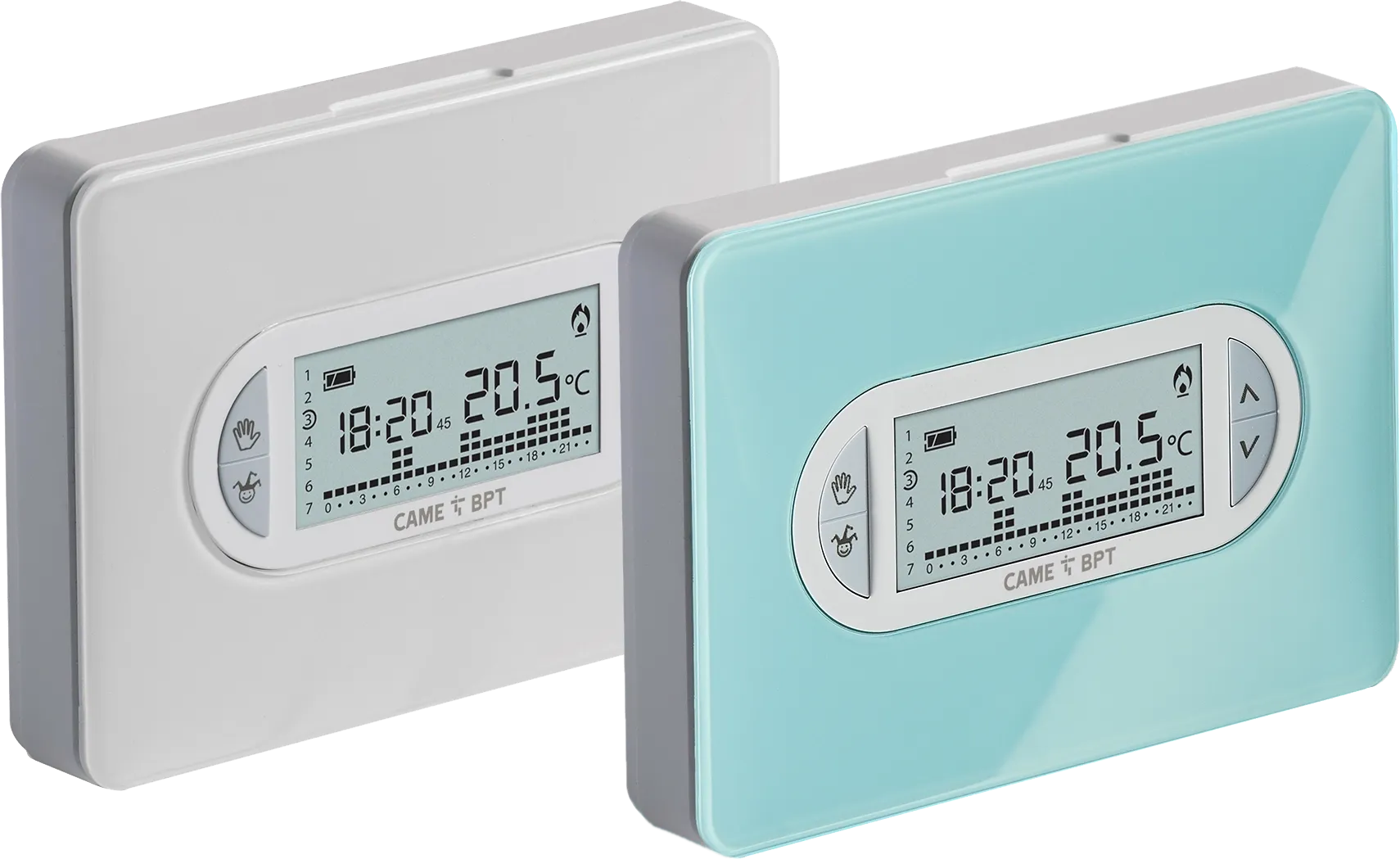 Týždenný programovateľný digitálny termostat v bielej farbe, s vymeniteľnými krytmi vo farbách ICE white (ľadová biela) a KRISTAL blue (krištáľovo modrá). Napájaný tromi 1,5V batériami typu AAA.