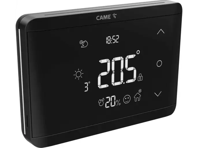 Čierny nástenný chronotermostat s dotykovým ovládaním.