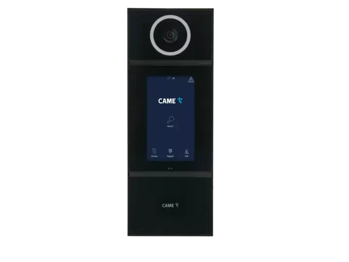 Vstupný panel videovrátnika s dotykovým displejom pre systém IP360, určený na povrchovú montáž na stenu.