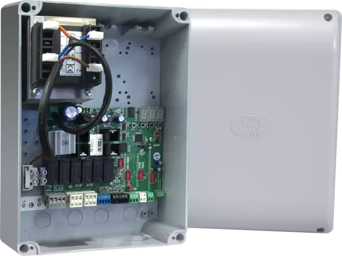 Multifunkčná riadiaca elektronika ZL65 pre 24 V pohony jednokrídlových alebo dvojkrídlových brán s programovacím displejom, samo diagnostikou bezpečnostných prvkov a integrovaným rádiovým dekodérom. Umožňuje pripojenie tradičného bezpečnostného a ovládacieho príslušenstva. Podporuje pripojenie bezdrôtového bezpečnostného príslušenstva série RIO cez konektor RIO-CONN, rádio frekvenčnej karty pre diaľkové ovládače alebo antény, ďalej RFID snímačov bezkontaktných kariet / čipov, či kódových klávesníc pomocou konektora R700/R800 a tiež obsahuje slot RSE pre pripojenie CAME KEY pre možnosť vzdialeného pripojenia a ovládania pomocou technológie CAME CONNECT.